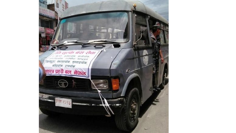 सशस्त्रको हुलदङ्गा व्यवस्थापन तालीम शिक्षालय लामापाटनको एउटा बसले सर्वसाधारणलाई निःशुल्क सेवा दिने भएको तालीम शिक्षालय प्रमुख वरिष्ठ प्रहरी उपरीक्षक राजेन्द्र बस्नेतले जानकारी दिनुभयो । लामा पाटनबाट बिहान १० बजे छुट्ने बस अमरसिंहचोक, मुस्ताङचोक, छोरेपाटन, लेकसाइड, जिरो किमी, सिर्जनाचोक, न्यूरोड, चिप्लेढुङ्गा, नदीपुर, बगर, रानीपौवाको रुटमा दिउँसो ४ बजेसम्म चल्नेछ ।