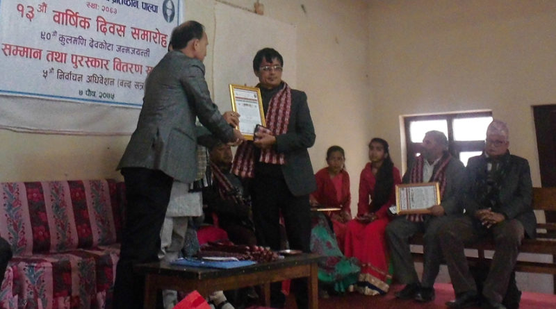 पाल्पा । नेपाल प्रेस युनियन पाल्पाका पूर्व सभापति, जिल्लाका क्रियाशिल पत्रकार प्रकाश नेपाल सम्मानित भएका छन् । साहित्य तथा स्वास्थ्य प्रतिष्ठान पाल्पाले पत्रकारिताको माध्यमबाट जिल्लाको शैक्षिक, सामाजिक, आर्थिक र साहित्य क्षेत्रमा पु¥याएको महत्वपूर्ण योगदानको मुल्याङ्कन गर्दै नेपाललाई शनिबार सम्मान गरेको हो । प्रतिष्ठानले आफ्नो १३ औं साधारण सभा तथा पाँचौ अधिवेशनका अवसरमा शक्तिराज स्मृति सञ्चार प्रतिभा पुरस्कारबाट नेपाललाई सम्मान गरेको छ । कार्यक्रमका प्रमुख अतिथि तथा शिक्षा समन्वय इकाई पाल्पाका प्रमुख मोती पौड्याल र प्रतिष्ठानका अध्यक्ष पुस्करराज रेग्मीले नेपाललाई संयुक्त रुपमा नगद र प्रमाण पत्रले सम्मान गरेका थिए । नेपाल, बुटवल टुडे दैनिकका उपसम्पादक, माउन्टेन टेलिभिजन र अभियान राष्ट्रिय दैनिकका जिल्ला संवाददाता हुन् ।