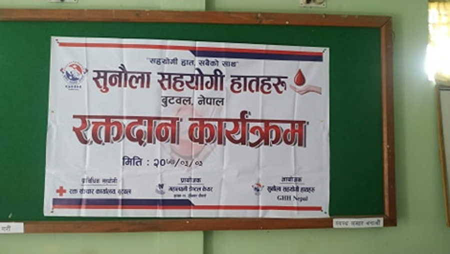 रेडक्रस भवन नेपालगन्जरोड बुटवलमा असार ३ गते आयोजित रक्तदान कार्यक्रमको संयोजकत्व बयस्कर राना मगरले गरेका थिए भने महालक्ष्मी डेण्टल केयरले प्रायोजन गरेको थियो ।