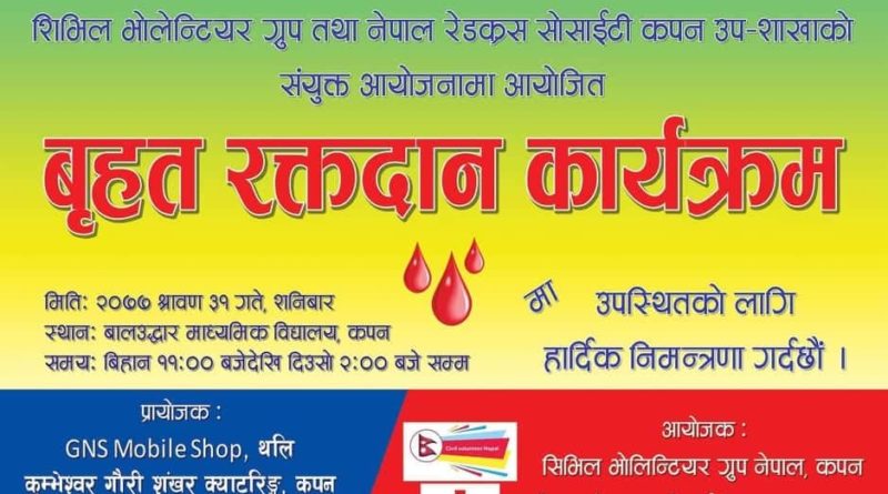 बाल उद्दार मा बि कपनमा बिहान १० बजेदेखि दिउँसो २ बजे सम्म रक्तदान कार्यक्रम राखिएको आयोजकले जनाएको छ ।