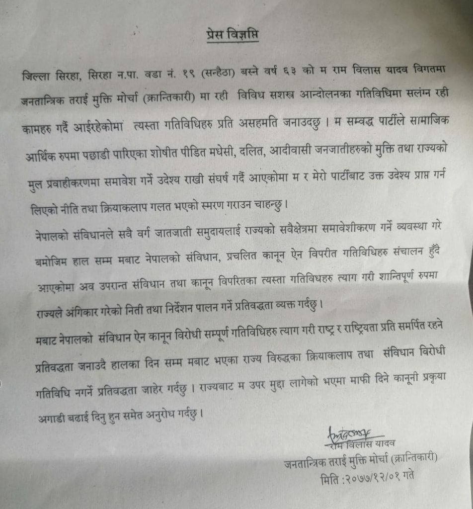 ‘गोइत’ समूहका उपाध्यक्ष रामविलास यादवले आत्मसर्पण गरेको पत्र ।