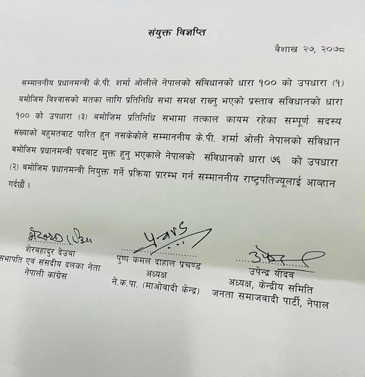नेपाली कांग्रेसका सभापति शेरबहादुर देउवा, नेकपा माओवादी केन्द्रका अध्यक्ष पुष्पकमल दाहाल र जसपा नेपालका अध्यक्ष उपेन्द्र यादवले संयुक्त वक्तव्य जारी गरी दुई वा दुईभन्दा बढी दलका बहुमत सांसदहरूको समर्थन प्राप्त नेतालाई प्रधानमन्त्री नियुक्त गर्नेगरी प्रक्रिया थाल्न राष्ट्रपति विद्यादेवी भण्डारीलाई आह्वान गरेका हुन् ।