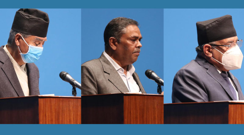 काठमाडौं । विपक्षी दल नेपाली कांग्रेस, माओवादी केन्द्र र जसपाको उपेन्द्र यादव पक्षले नयाँ सरकार गठनका लागि संविधानको धारा ७६ को २ अनुसार प्रक्रिया थाल्न राष्ट्रपतिसँग आग्रह गरेका छन् ।