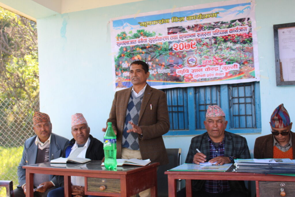 कृषि ज्ञान केन्द्र गुल्मीले कृषकको घरबगैचाँमा पुगि कृषकहरूका समस्या संकलन तथा आवश्यक ज्ञान सीप दिन थालेको छ । कृषकहरूको घरआँगनमै पुगी कृषकको समस्या संकलन र आवश्यक सुझाव प्रदान गरी सुन्तला उत्पादन वृद्धि गर्न कृषि ज्ञान केन्द्र गुल्मीले कृषकसँग विज्ञ कार्यक्रम सुरू गरेको हो । कृषकसँग विज्ञ कार्यक्रमले सुन्तला उत्पादक कृषकहरू पनि उत्साहित भएका छन् । धुर्काट गाउँपालिका–३ पिपलधाराका स्थानीय कृषक नरमान खड्काले यस कार्यक्रमको माध्यमद्वारा सुन्तला खेति गर्दा आवश्यक पर्ने ज्ञान सीप प्राप्त गर्न पाउँदा खुसि लागेको बताउनुभयो ।