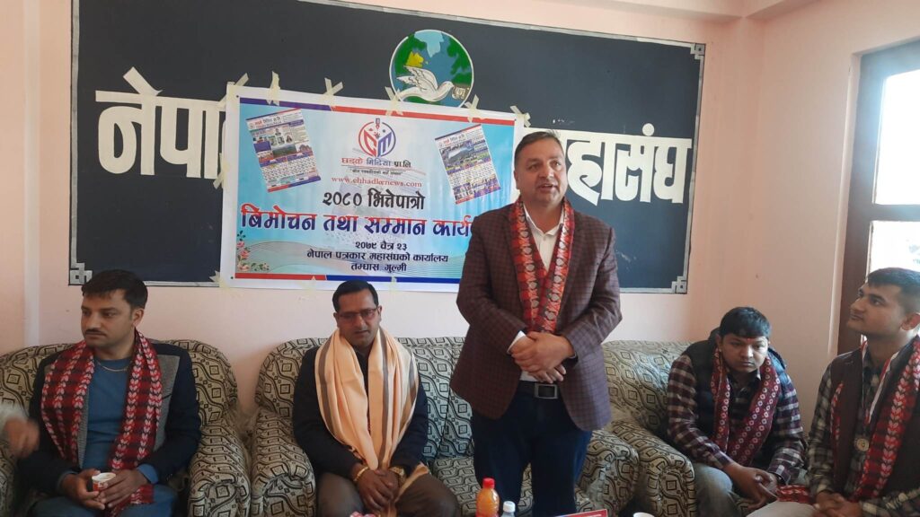 छड्के मिडिया प्रा.लि गुल्मीले नयाँ वर्ष २०८० को भित्ते पात्रो विमोचन तथा पत्रकार सम्मान गरेको छ । बिहिबार नेपाल पत्रकार महासंघ गुल्मीको सभाहलमा नयाँ वर्ष २०८० को भित्ते पात्रो विमोचन तथा विगत लामो समय देखि पत्रकारिता गर्दै आउनुभएका मिडिया उद्यमी तथा सञ्चारकर्मीलाई सम्मान गरेको हो । छड्के मिडिया प्रालिले प्रकाशन गरेको आगामी वर्ष २०८० को भित्ते पात्रो रेसुंगा नगरपालिकाका नगरप्रमुख खिलध्वज पन्थी, नेपाल पत्रकार महासंघ गुल्मीका अध्यक्ष टोपलाल अर्याल र पूर्व अध्यक्ष जनार्दन घिमिरेले विमोचन गर्नुभएको थियो ।