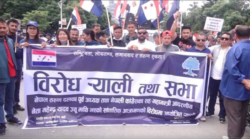 काठमाडौं । नेपाली कांग्रेसका सह–महामन्त्री महेन्द्र यादवमाथि भएको आक्रमणको विरोध गर्दै नेपाल तरुण दलले काठमाडौंमा विरोध र्याली निकालेको छ ।