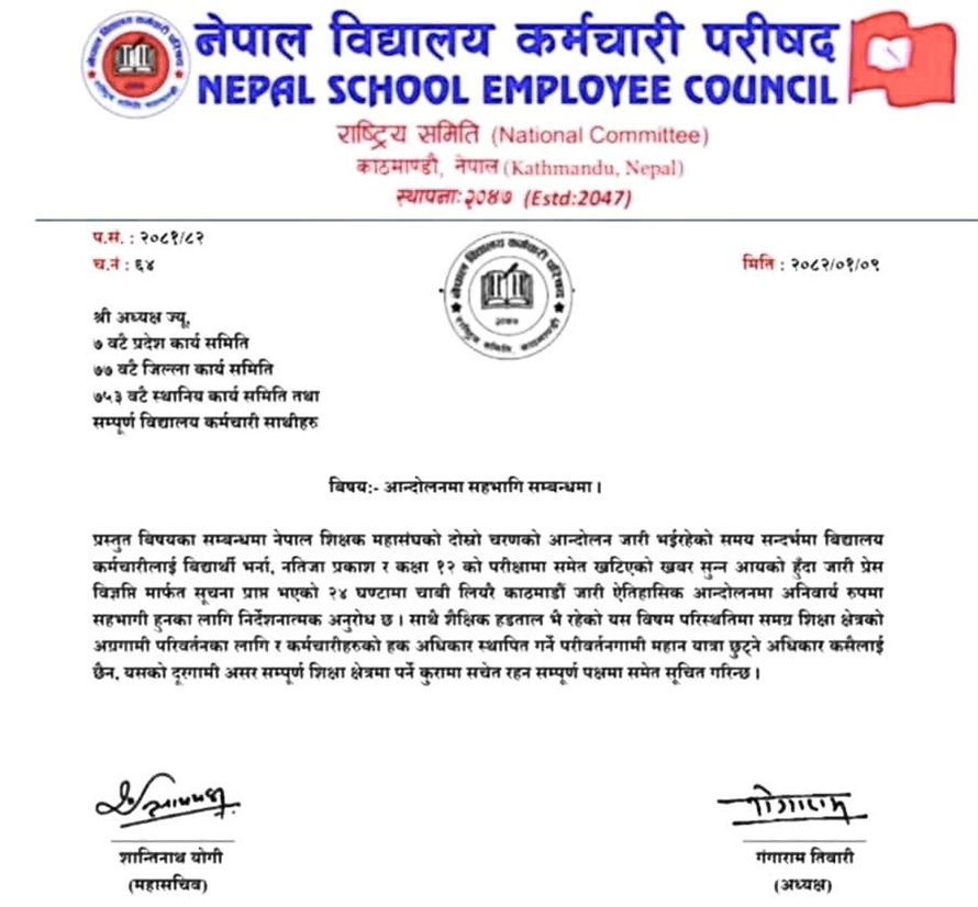 नेपाल शिक्षक महासंघको आयोजनामा चैत २० गतेदेखि काठमाडौंमा भइरहेको आन्दोलनमा सहभागी हुन अपिल गर्दै परिषदुले भनेको छ “आन्दोलन जारी भइरहेको समय सन्दर्भमा विद्यालय कर्मचारीलाई बिद्यार्थी भर्ना, नतिजा प्रकाश र कक्षा १२ को परीक्षामा समेत खटिएको खबर सुन्न आयको हुँदा जारी प्रेस विज्ञप्ति मार्फत सूचना प्राप्त भएको २४ घण्टामा चाबी लियरे काठमाडौं जारी ऐतिहासिक आन्दोलनमा अनिवार्य रुपमा सहभागी हुनका लागि निर्देशनात्मक अनुरोध छ।”