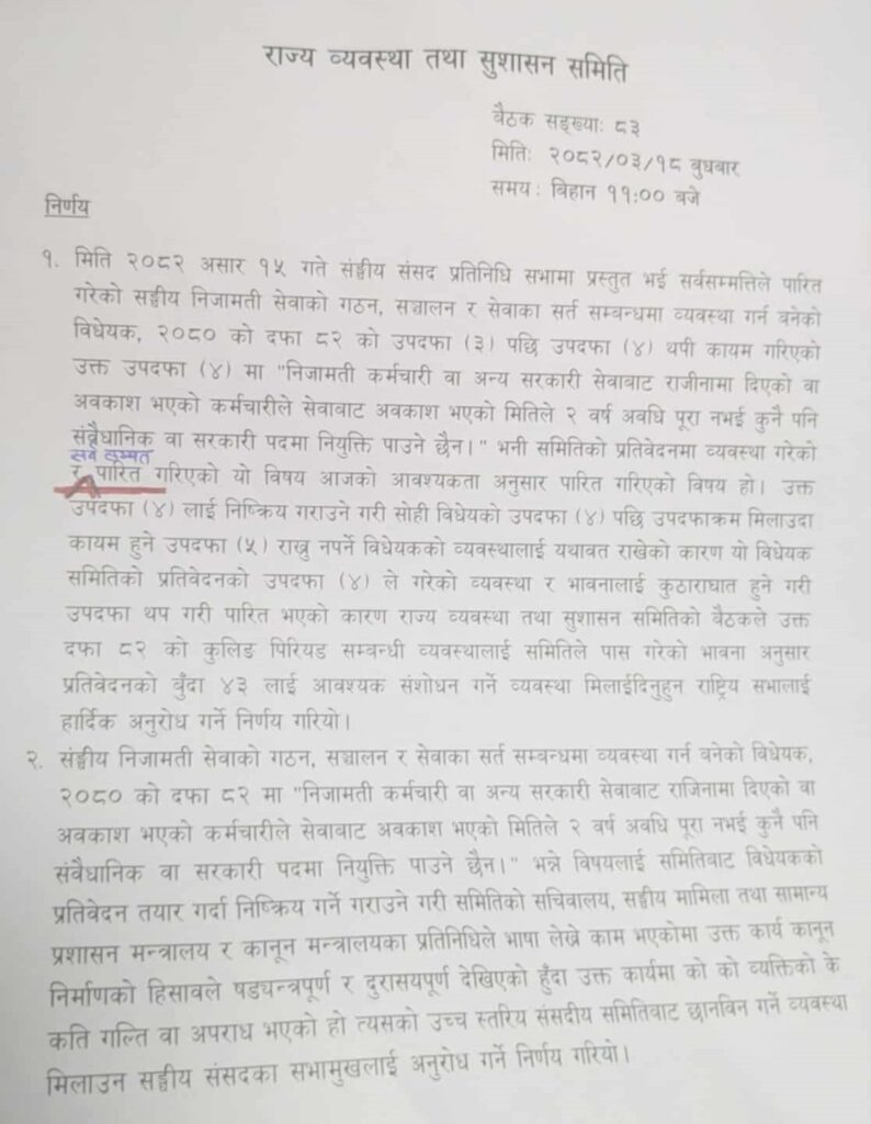 निजामती विधेयकको त्रुटि सच्याउन राष्ट्रिय सभालाई र छानविनका लागि सभामुखलाई राज्य व्यवस्था समितिको आग्रह