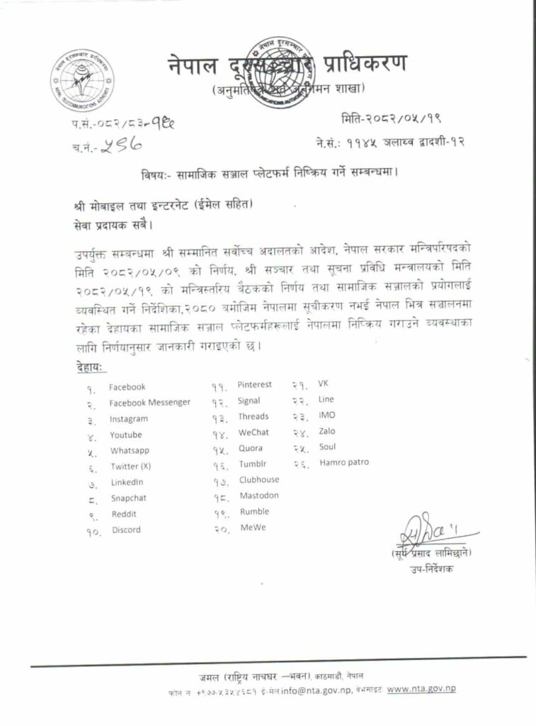उनका अनुसार, सूचीकरण नगरेका सामाजिक सञ्जालहरू आजैदेखि निष्क्रिय पारिनेछन्, तर यदि दर्ता गर्न आएमा ती प्लेटफर्महरू त्यसै दिनदेखि पुनः सञ्चालन गर्न पाइने छन्।