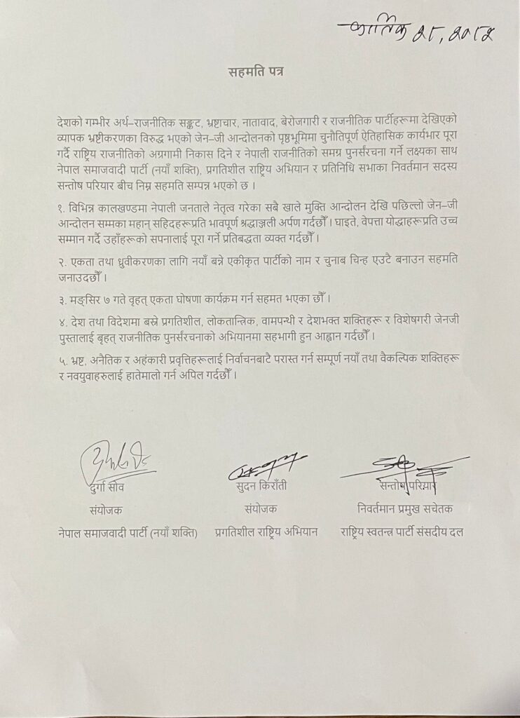 काठमाडौँ । नेपाल समाजवादी पार्टी (नयाँ शक्ति), प्रगतिशील राष्ट्रिय अभियान तथा शुक्रबार मात्र राष्ट्रिय स्वतन्त्र पार्टी (रास्वपा) त्यागेका सचिवालय सदस्य सन्तोष परियारबीच पाँच बुँदे सहमति भएको छ।