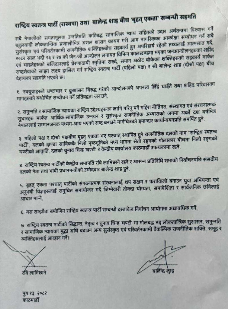 काठमाडौं । राष्ट्रिय स्वतन्त्र पार्टी (रास्वपा) का सभापति रवि लामिछाने र काठमाडौं महानगरपालिकाका मेयर बालेन शाहले एउटै दलमार्फत प्रतिनिधिसभा निर्वाचनमा सहभागी हुने निर्णयसहित ७ बुँदे सम्झौता गरेका छन्।