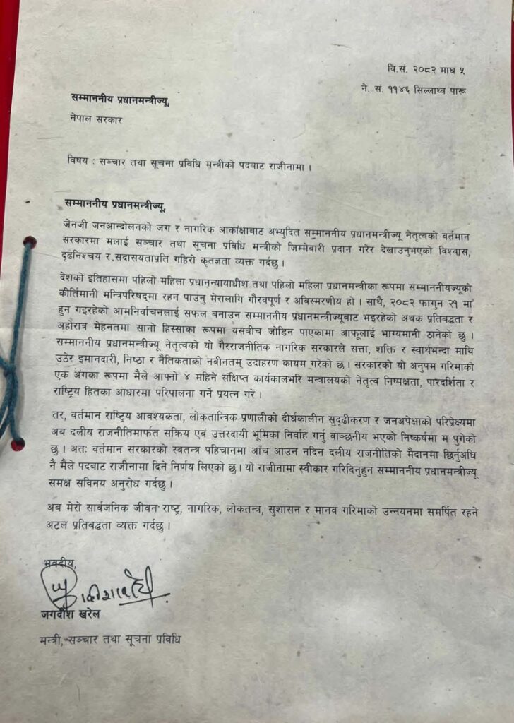 सञ्चारमन्त्री खरेलले दिए राजीनामा